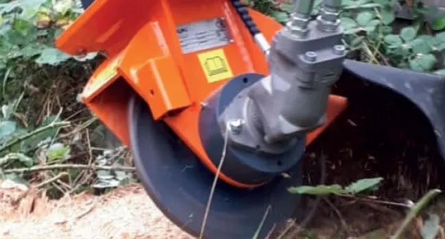 The cutting wheel turns at a relatively low speed but with very high torque, which ensures that power goes into the stump rather being lost to aerodynamic drag.